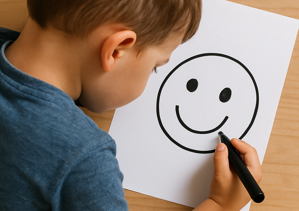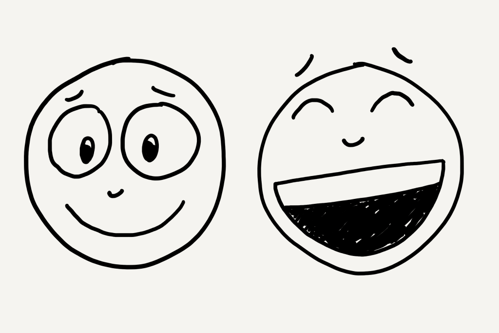 Enkle emoji-stil tegninger, der viser, hvordan man bringer følelser til live med simple streger. For eksempel: